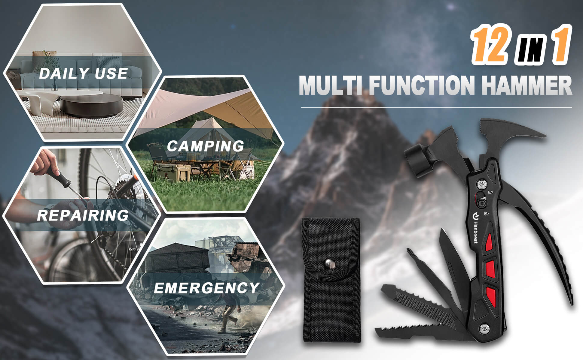 Discover the versatility of our Multi-Functional Hammer, perfect for various scenarios, from camping and hiking to small repairs, fishing, and DIY projects. This all-in-one tool effortlessly adapts to your needs, whether you're exploring the great outdoors, fixing things around the house, or working on a creative endeavor. With this adaptable hammer by your side, you'll be prepared to tackle any challenge that comes your way.