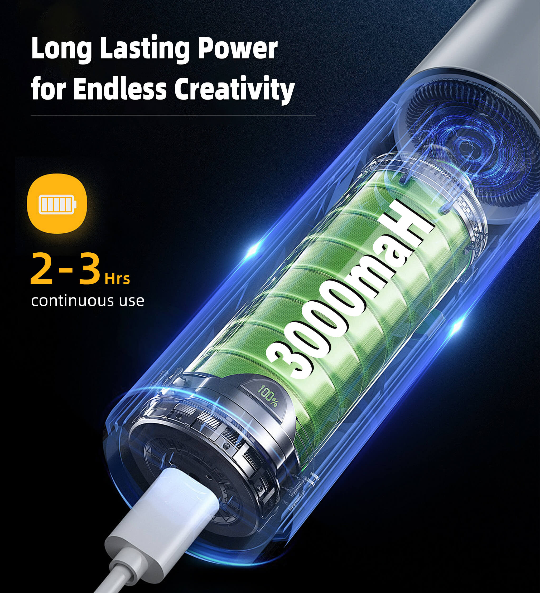 Hanboost adopts USB-C to charge, which is convenient and fast, an powered by a high-capacity 3000mAh battery, it offers 2-3 hours of continuous use.